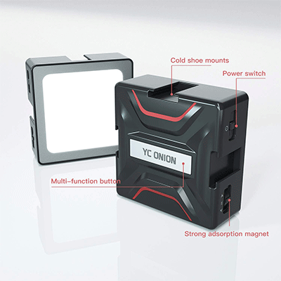 نور ال ای دی YC Onion Brownie RGB LED با حداکثر قدرت 6 وات ، دارای 25 ال ای دی ، دارای حالت RGB 360 ، با قابلیت تنظیم میزان روشنایی از 10 تا 100 درصد ، با خاصیت آهن ربایی با امکان اتصال سطوح فلزی و اتصال بر روی دوربین از طریق مانت ، دارای باتری لیتیومی با ظرفیت 1.5 تا 2 ساعت، با قابلیت شارژ از طریق پورت USB Type-C