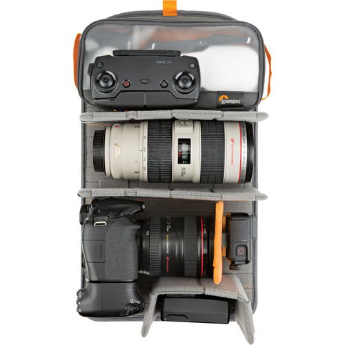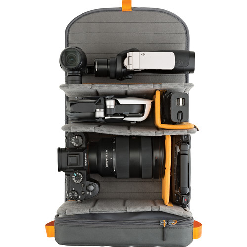 این کوله پشتی لوپرو Lowepro FreeLine 350 AW یک کیف همه کاره است که دارای دو فضای اصلی است. در داخل محفظه اصلی جادار، یک سیستم پارتیشن متحرک و تاشو سه قفسه تشکیل می دهد که می تواند برای ذخیره تجهیزات دوربین، فیلم برداری، صوت یا رسانه های دیجیتال استفاده شود. جداکننده ها می توانند یک کیت دوربین DSLR با لنز 200-70 میلی متر با دیافراگم f:2.8 را در خود جای دهند و برای افزایش توانایی سازماندهی محتویات این کیف ، یک کیف تجهیزات Lowepro Gear Box در آن قرار داده شده است.