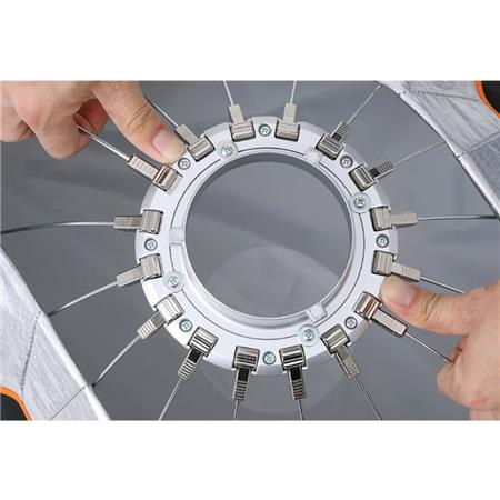 این سافت باکس بسیار آسان باز و بسته می شود. برای راه اندازی آسان، به سادگی میله ها را از حلقه سرعت بردارید تا درسر جای خود کلیک کنند. اکثر عکاسان دو میله ی مخالف را به طور همزمان بلند می کنند و به طور قابل توجهی این روند را تسریع کرده و در زمان صرفه جویی می کنند. برای از کار انداختن سریع، می توانید میله را کمی بالا بیاورید و دکمه ی آن را فشار دهید و سپس به کار بعدی خود بپردازید.