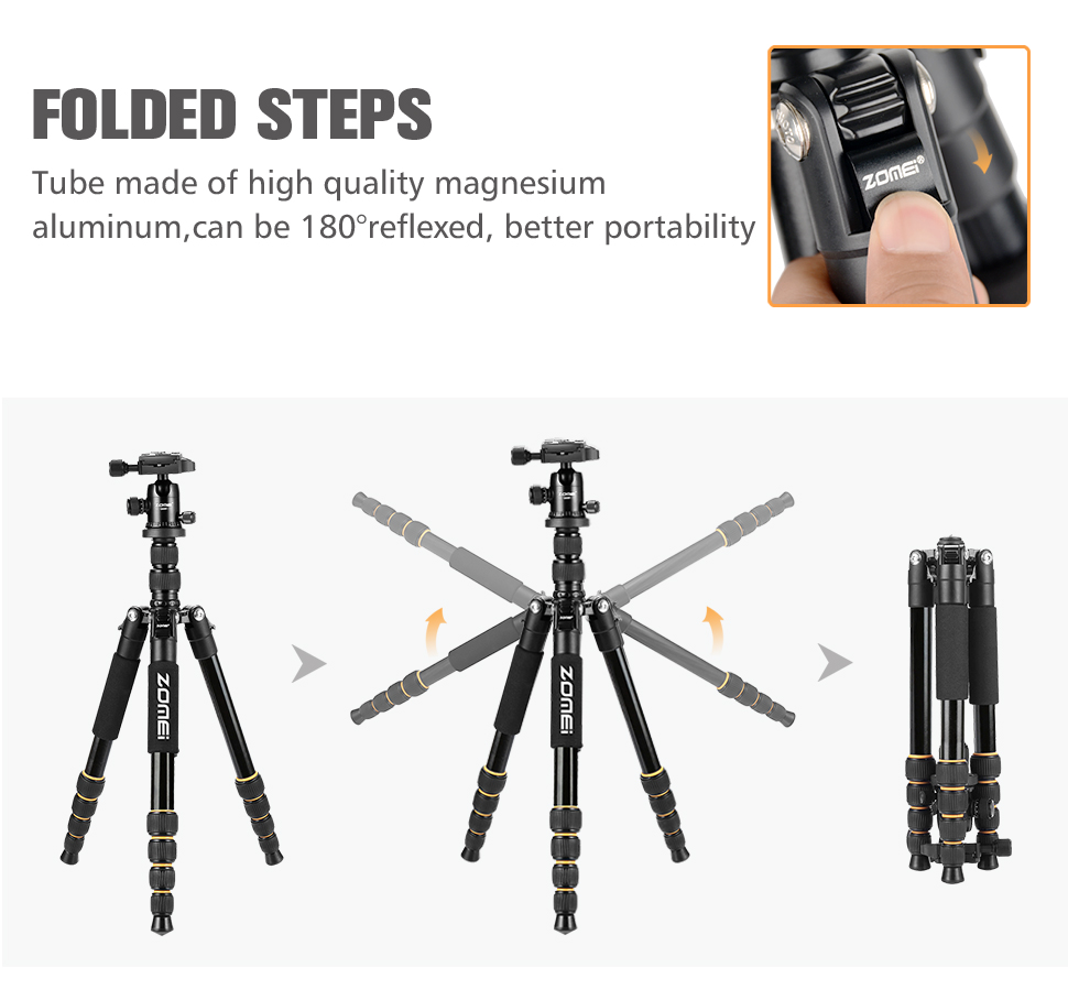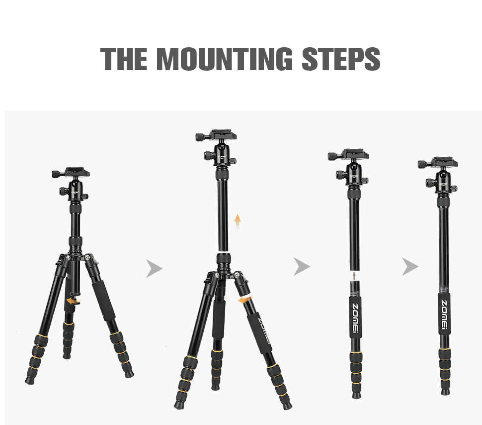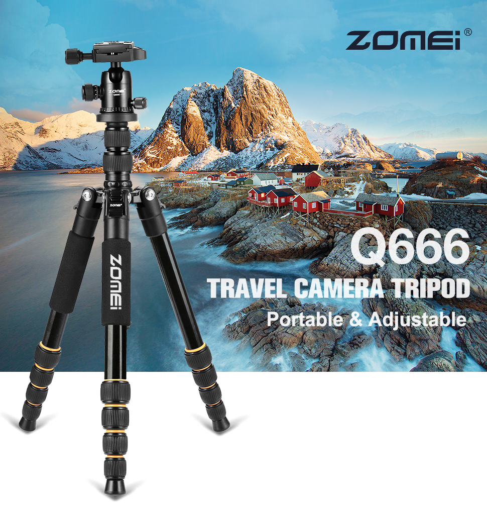 سه پایه عکاسی زومی ZOMEI Q666 با تحمل وزن تا 10 کیلوگرم ، با حداکثر ارتفاع 156 سانتی متر ، با ارتفاع جمع شده 35 سانتی ، حداقل ارتفاع 52 سانتی متر ، با وزن 1.85 کیلوگرم ، با قابلیت تبدیل به تک پایه، به همراه کاور حمل