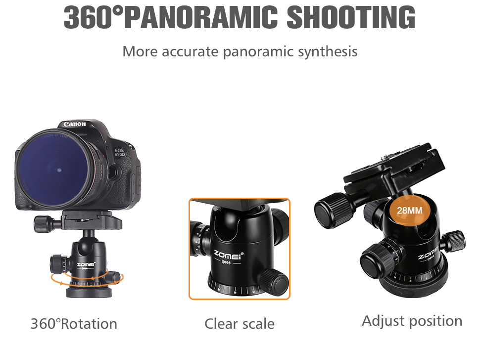 پیچ های تنظیم زاویه/ فشار جداگانه برای قفل هد و چرخش افقی برای تنظیمات آسان و دقیق وجود دارد. با استفاده ی آسان از Zomei Q666 عکسهای پانورامای دقیق ایجاد کنید، از مقیاس چرخش افقی تدریجی برای دقت بیشتر هنگام تراز کردن عکس بعدی خود استفاده کنید.