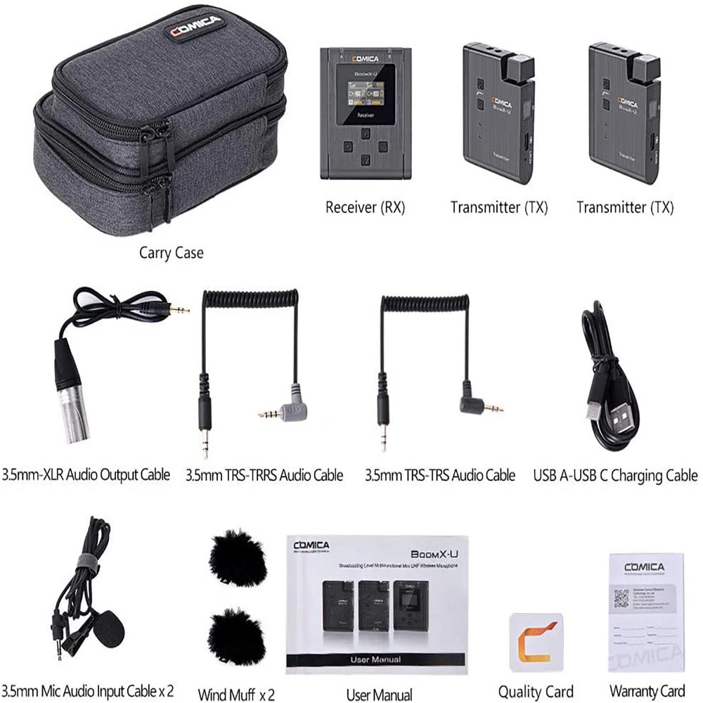 Comica BoomX-U U2 که برای خبرنگاران سیار، فیلم برداران و vlogger ها طراحی شده است، یک سیستم میکروفون دیجیتال بی سیم فوق العاده فشرده با دو میکروفون و یک گیرنده ی دو کاناله است. این میکروفون یک سیستم انتقال قابل اعتماد با صدای واضح تا فاصله ی 394 فوت (120 متر) و یک راه حل کامل برای ضبط گفتگو، مصاحبه و گفتار یک شخص در حال صحبت، مستقیماً در یک دوربین بدون آینه یا DSLR، یک دوربین فیلم برداری یا یک دستگاه تلفن همراه، ارائه می دهد