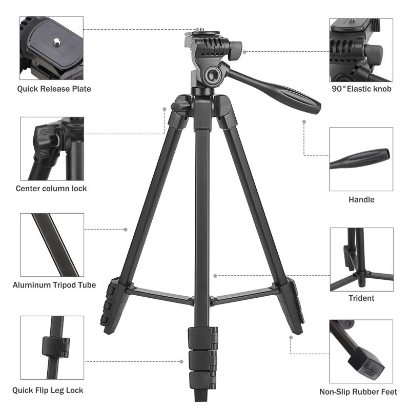 سه پایه عکاسی زومی مدل T90 دارای وزنی سبک (570 گرم) و ابعاد کوچک مناسب برای دوربین های کامپکت و تلفن های همراه (نگه دارنده موبایل باید جداگانه تهیه شود) است.