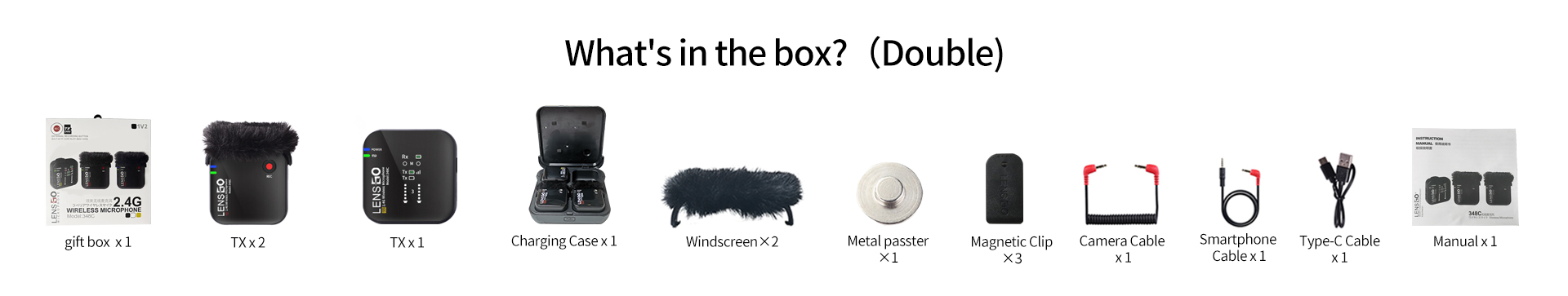 کیت میکروفن بی سیم Lensgo 348C شامل دو فرستنده دارای میکروفن داخلی و شکاف کارت حافظه میکرو اس دی (تا 32 گیگ ) جهت ضبط همزمان ، یک گیرنده با امکان اتصال به تلفن های هوشمند، دوربین های بدون آینه ، DSLR ،دارای باتری داخلی با ظرفیت 7 ساعت