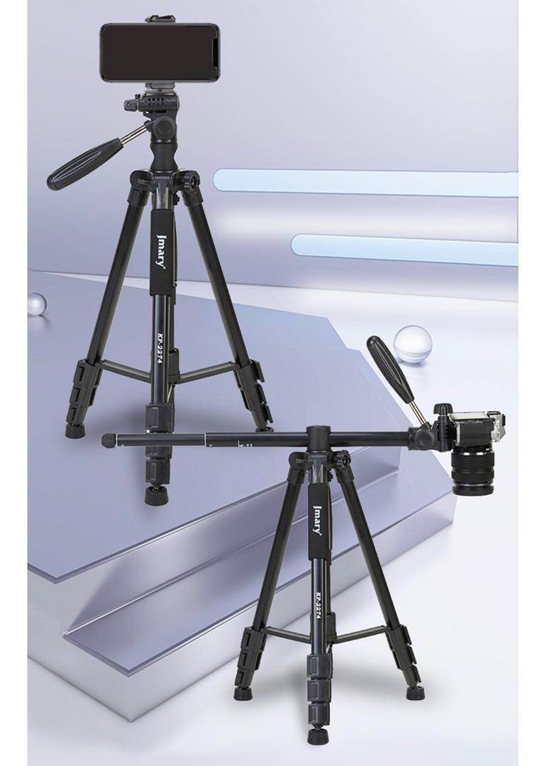 سه پایه عکاسی جی مری Jmary KP2274 برای موبایل و دوربین، با قابلیت افقی شدن ستون مرکزی به حالت T شو (صلیبی) مناسب عکاسی با موبایل و دوربین های بدون آینه یا DSLR کوچک ، با حداکثر ارتفاع 167 سانتی متر ، ارتفاع جمع شده 56 سانتی متر ، حداقل ارتفاع 54 سانتی متر ، با تحمل وزن 3 کیلوگرم ، وزن 1.5 کیلوگرم ، با قابلیت تبدیل شدن به تک پایه ، به همراه کیف حمل مخصوص