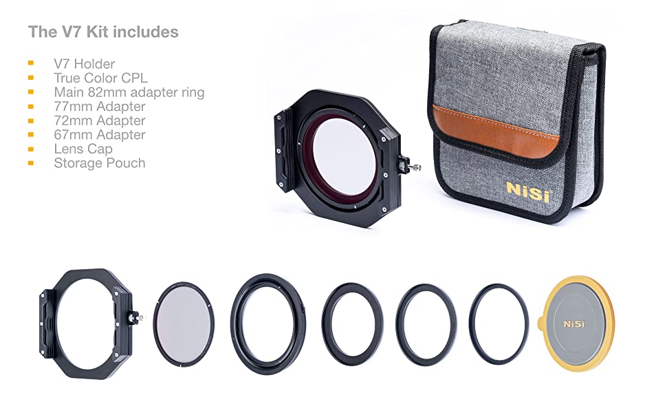 کیت نگهدارنده فیلتر 100 میلیمتری مدل V7 به همراه فیلتر پلاریزه دایره ای NC True Color از NiSi به همراه درب پوش ( فیلتر شامل حلقه نصب اصلی 82 میلیمتری، حلقههای آداپتور 77، 72، و 67 میلیمتری )