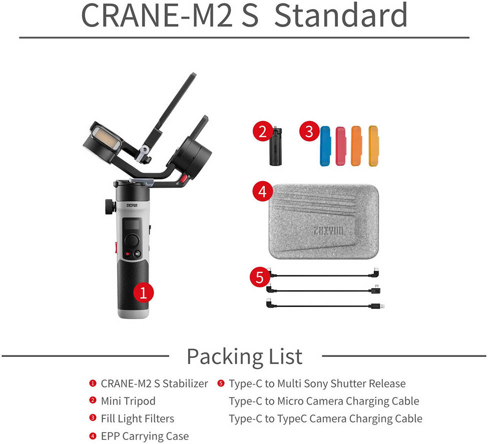 کوچک تر و حتی سبک تر از Zhiyun-Tech می باشد و با قدرتی حتی بیشتر از مدل قبلی خود برای پشتیبانی از دوربین های کامپکت، تلفن های هوشمند و دوربین های اکشن تا 998 گرم طراحی شده است. M2 S تمام ویژگی های عالی M2 را در خود جای داده است و همچنین عملکرد های بیشتری را اضافه کرده است، از جمله حمل بار بالاتر، زمان اجرای طولانی تر، شارژ سریع PD، دستگیره ی کوچک تر، طراحی شیک دو رنگ، پشتیبانی از بلوتوث 5، صفحه quick release با طراحی جدید و سریع، و چراغ های LED داخلی.