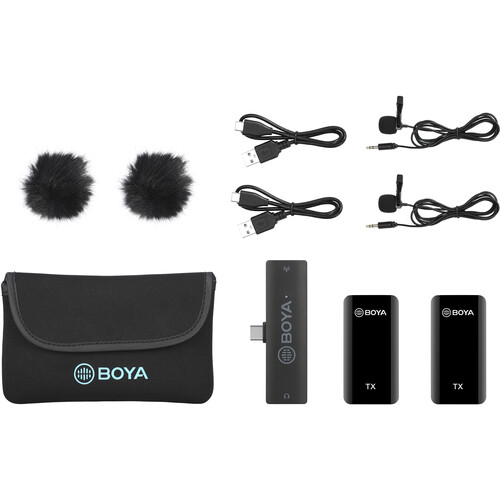 کیت میکروفن بی سیم بویا BOYA BY-XM6-S5 شامل یک گیرنده دو کاناله برای تلفن های همراه با پورت USB Type-C ،دارای باتری داخلی با ظرفیت 7 ساعت، دو فرستنده دارای میکروفن داخلی ، دو میکروفن یقه ای جهت اتصال به فرستنده ( جهت ایجاد ظاهر کوچکتر ) ، کابل های یو اس بی جهت شارژ ، فوم خز دار بادگیر و کاور همراه