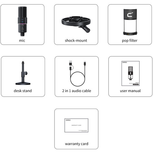 پک این میکروفون با یه استند رومیزی عرضه شده که نیاز به پایه بازویی را رفع میکند. بواسطه کابل تایپ سی که دارد به موبایلهای تایپ سی و لپ تاپ (از طریق پورت یو اس بی) وصل می شود و بدون نیاز به نرم افزار خاصی، تجربه ضبط صدای بی نظیری به شما میدهد. این میکروفون از سه افکت صدای پیشفرض پشتیبانی میکند که صدا را در حالت های نازک، ضخیم و طبیعی تغییر میدهد.