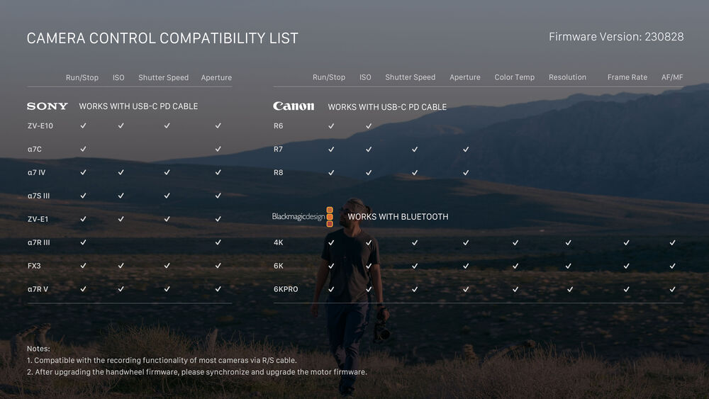 Nano II با موتورهای لنز نسل قبلی Nucleus-Nano و Nucleus-M سازگاری دارد و این امکان را فراهم میکند که به راحتی با تجهیزات قبلی خود ادغام کنید. نرمافزار فعلی بهطور کامل از همه کنترلها برای BMPCC 4K، 6K و 6K Pro از طریق بلوتوث پشتیبانی میکند، با کنترل جزئی دوربین شامل اجرای/توقف، سرعت شاتر، ISO و تنظیم آیریس برای دوربینهای سونی FX3، a7S III، a7R V، ZV-E1، ZV-E10 و کانن R7 از طریق کابلهای USB-C PD.