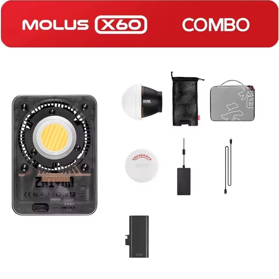 کیت کمبو نور ژیون نور MOLUS X60 Bi-Color (Combo Kit) مجهز به باتری دستهای (Grip Battery) ، با خروجی نور ۲۶۸۰ لوکس در فاصله ۱ متری (در دمای رنگ ۶۵۰۰ کلوین) ، دمای رنگ قابل تنظیم: ۲۷۰۰ تا ۶۵۰۰ کلوین (CCT)، قابل استفاده با برق AC یا باتری ، امکان کنترل از روی دستگاه و از طریق اپلیکیشن ،شاخصهای رنگ CRI برابر ۹۵ و TLCI برابر ۹۷ ،طراحی فوقالعاده جمعوجور با سیستم خنککننده فعال ،دارای مانت اختصاصی ZY، با قابلیت اتصال مبدل Bowens بهصورت اختیاری ، شامل رفلکتور مینی و گنبد پخشکننده نور (Diffusion Dome) به همراه آداپتور برق، باتری و کیف حمل