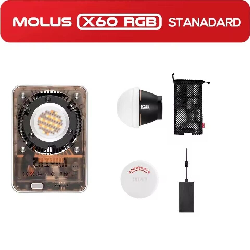 نور ثابت آر جی بی ژیون Zhiyun MOLUS X60RGB RGB مناسب برای تولیدکنندگان محتوا و ولاگرها ، با خروجی نور 2010 لوکس در فاصله 1 متری (با دمای 6500 کلوین) ، دمای رنگ 2700 تا 6500 کلوین با کنترل کامل رنگهای RGB، قابلیت استفاده با برق مستقیم (AC) یا باتری، با امکان کنترل از روی دستگاه و از طریق اپلیکیشن، با شاخص نمود رنگ (CRI) 95 شاخص سازگاری با دوربین (TLCI): 98، با طراحی فوقالعاده جمعوجور با سیستم خنککنندگی فعال، مانت اختصاصی ZY با پشتیبانی از آداپتور اختیاری Bowens، شامل کاسه رفلکتور مینی و گنبد پخش نور (دیفیوزن) ، همراه با آداپتور برق