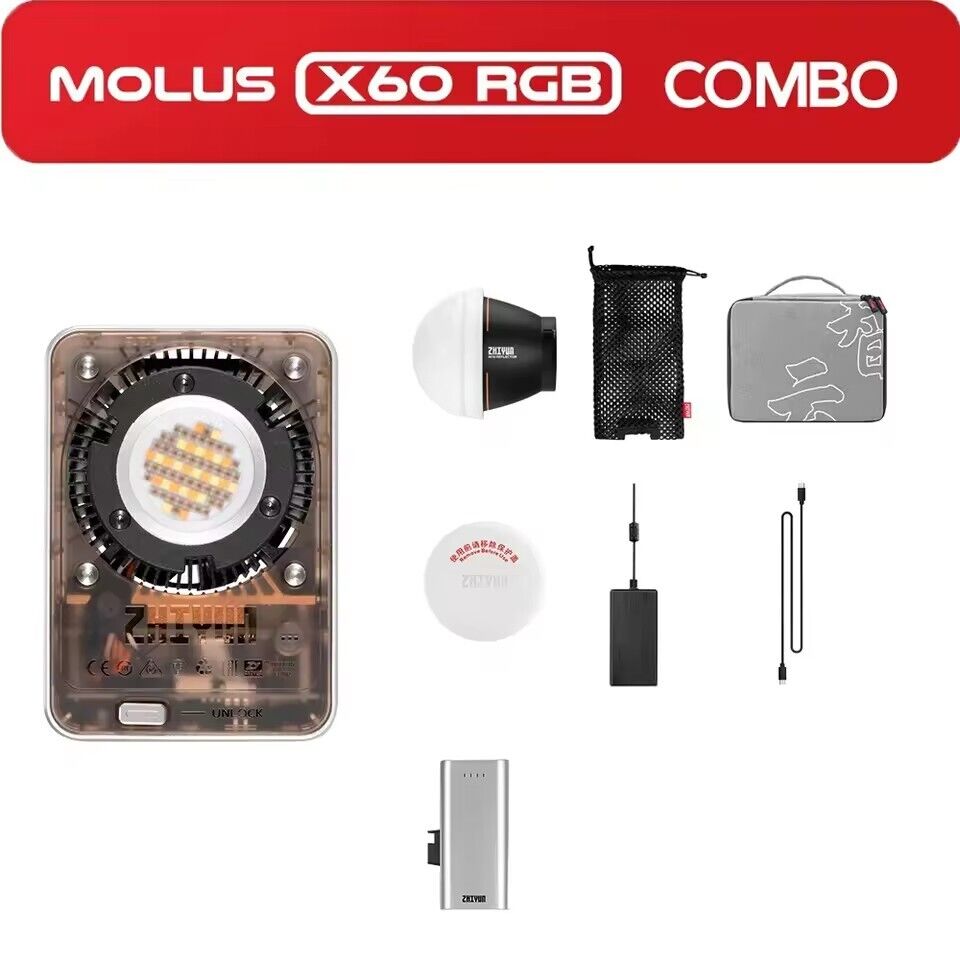 کیت کمبو نور آر جی بی ژیون Zhiyun MOLUS X60RGB RGB (Combo Kit) نور همراه با باتری دستهای (Grip Battery) ، با خروجی 2010 لوکس در فاصله 1 متری (در دمای 6500 کلوین)، دمای رنگ قابل تنظیم 2700 تا 6500 کلوین با کنترل کامل رنگهای RGB ، قابلیت استفاده از برق مستقیم (AC) یا باتری ،کنترل از روی دستگاه و همچنین از طریق اپلیکیشن موبایل ،شاخص CRI: 95 و شاخص TLCI: 98 ، با طراحی بسیار جمعوجور با سیستم خنککنندگی فعال ،دارای مانت اختصاصی ZY با امکان استفاده از آداپتور اختیاری Bowens، همراه با کاسه رفلکتور مینی و گنبد پخش نور (دیفیوزر) ،شامل آداپتور برق و کیف حمل