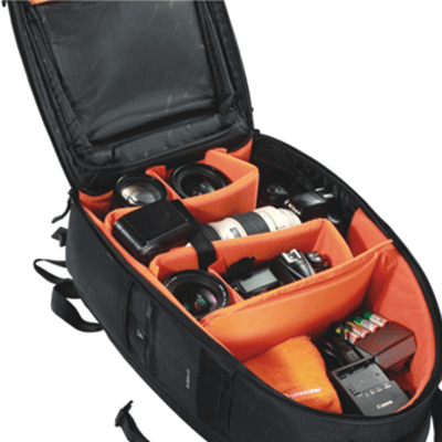 کیف کوله پشتی زیبا دارای ظرفیت1دوربین DSLR حرفه ای با گریپ و لنز متصل شده ( تاf/2.8 70-200 mm)، یک بدنه DSLR اضافی، 2-3 لنز اضافی ،لوازم جانبی (کارت حافظه، کابل، باتری و شارژر)، یک لپ تاپ تا 15 اینچ واید، سه پایه و قابلیت اتصال کیف لنز اضافی