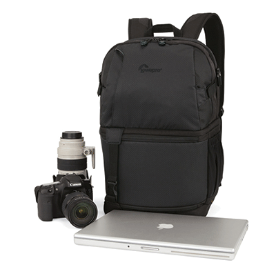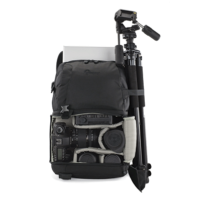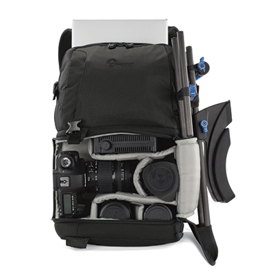 مناسب برای یک دوربین عکاسی حرفه ای ( بدون گریپ) به همراه یک یا 2 عدد لنز ، میکروفون ، فلاش، لوازم جانبی ، همچنین لب تاپ تا سایز 15 اینچ، دارای کاور باران و محفظه ای تفکیک شده برای نگهداری لوازم شخصی