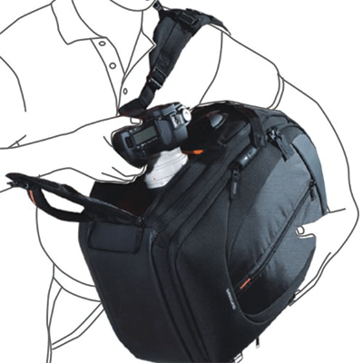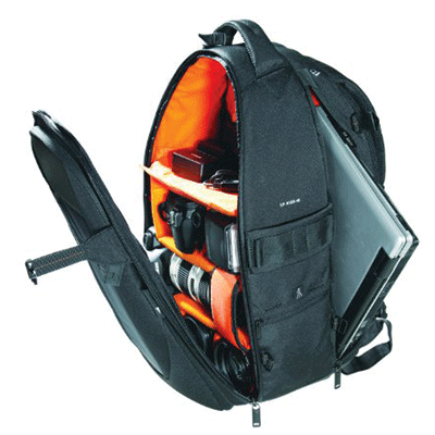 کیف کوله پشتی زیبا دارای ظرفیت یک دوربین پیشرفته DSLR به همراه لنز (تا لنز 200-70 f/2.8)، یک فلاش،3 یا 4 لنز اضافی،لوازم جانبی(کارت حافظه،باتری و شارژر)، بعلاوه یک لپ تاپ تا سایز 14.1 واید و نگه دارنده ی سه پایه.