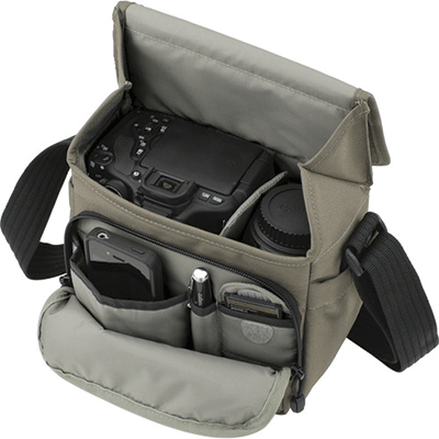 کیف شانه آویز لوپرو زیبا و بادوام دارای ظرفیت یک دوربین DSLR یا دوربین mirrorless یا یک دوربین DSLRبا لنز 18-55 متصل شده،1 یا 2 لنز اضافی و فلاش ،لوازم جانبی(کارت حافظه، کابل، باتری، شارژر).