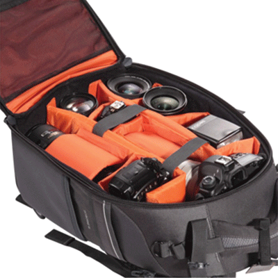 کیف کوله پشتی زیبا دارای ظرفیت1 ی عدد دوربین DSLRSحرفه ای با لنز متصل شده و گریپ و یک بدنه اضافه،4تا6 لنز، 2 فلاش و لوازم جانبی (کارت حافظه، کابل، باتری و شارژر)، به علاوه یک لپ تاپ تا 12 اینچ واید ونگه دارنده سه پایه.