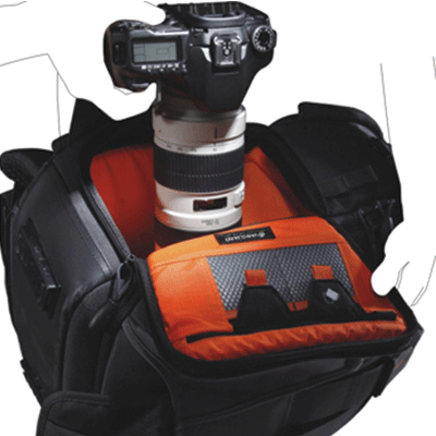 کیف کوله پشتی زیبا دارای ظرفیت 1 یا 2 عدد دوربین DSLRSحرفه ای،3تا4 لنز، 12 فلاش و لوازم جانبی (کارت حافظه، کابل، باتری و شارژر)، به علاوه یک لپ تاپ تا 15 اینچ ونگه دارنده سه پایه.