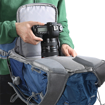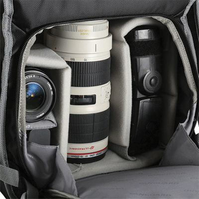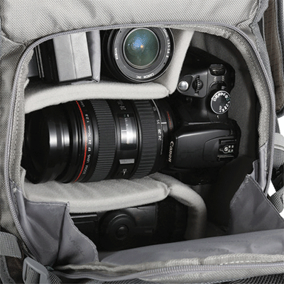 کیف کوله پشتی زیبا و ظرفیت برای یک دوربین حرفه ای DSLR با لنز متصل شده1 تا 2لنز اضافی ،1فلاش اضافی،لوازم جانبی(کارت حافظه، کابل، باتری، شارژر) ،یک سه پایه و یک تک پایه و تبلت.