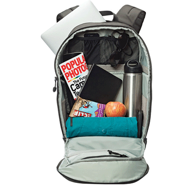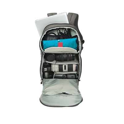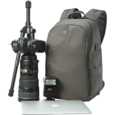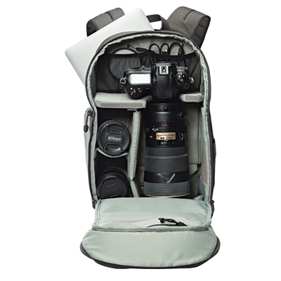 کوله پشتی سبک و زیبا دارای فضا برای یک دوربین حرفه ای DSLR با لنز متصل شده200-70میلی مترf/2.8 و 1 تا 2 لنز یا فلاش اضافی،لوازم جانبی(کارت حافظه، کابل، باتری، شارژر) ،یک سه پایه کوچک و لپ تاپ تا 15 اینچ، بند کمر.