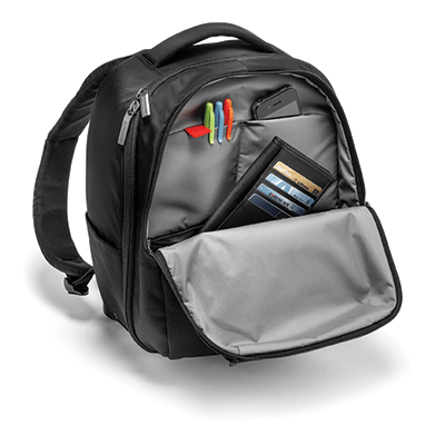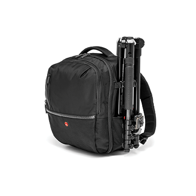 کیف کوله پشتی مانفرتو زیبا و سبک و دارای ظرفیت یک عدد دوربین DSLR حرفه ای با لنز استاندارد متصل شده و2عدد لنز اضافی ،لوازم جانبی(کارت حافظه،شارژر،کابل).