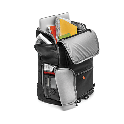کیف کوله پشتی مانفرتو زیبا و مقاوم و دارای ظرفیت یک عدد دوربین DSLR با گریپ، لنز70-200 5عددلنز اضافی،1 فلاش،لوازم جانبی(کابل،شارژر،کارت حافظه)،نگدارنده سه پایه،لپ تاپ تا15 اینچ.