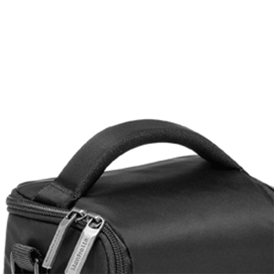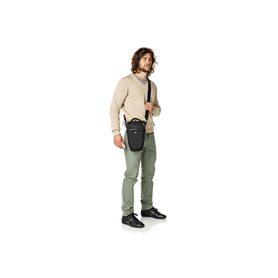 کیف پوزه ای مانفرتو زیبا و مقاوم و دارای ظرفیت یک عدد دوربین DSLR و لنز 200-70متصل شده ،تعداد کمی لوازم جانبی