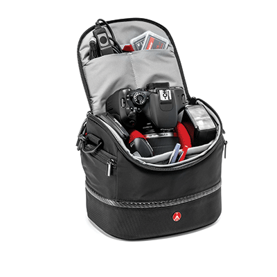 کیف شانه آویز مانفروتو زیبا و بادوام دارای ظرفیت یک دوربین DSLR باحرفه ای با لنز متصل شده، 1 فلاش،لوازم جانبی(کابل،باتری،کارت حافظه)