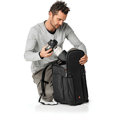 کیف MB MP-BP-20BBکوله پشتی حرفه ای مانفروتوزیبا و مقاوم و دارای ظرفیت دو عدد دوربین DSLR و لنز 200-70 3 لنز اضافی،فلاش،لوازم جانی(کارت حافظه،شارژر،کابل)،لپ تاپ تا 13 اینچ و تبلت،دارای نگه دارنده سه پایه.
