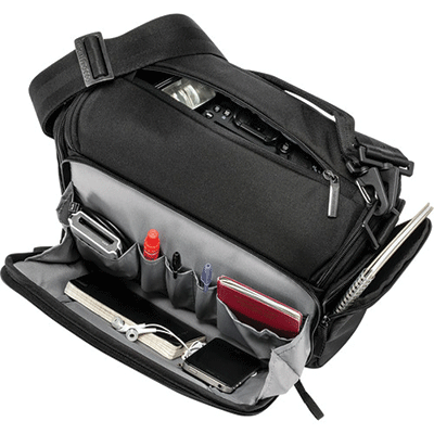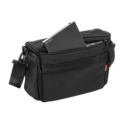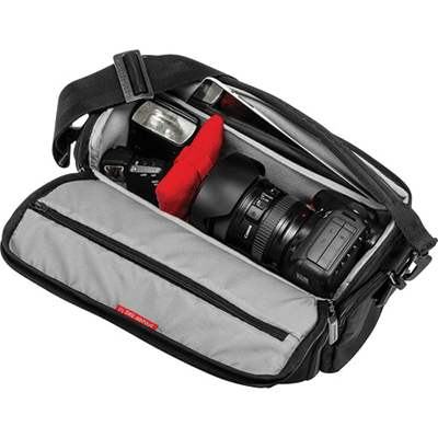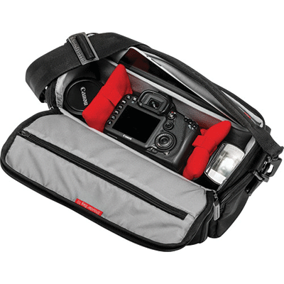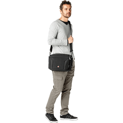 کیف شانه آویز مانفروتو زیبا و بادوام دارای ظرفیت یک عدد دوربین DSLR و 2 لنز اضافی،فلاش،لوازم جانی(کارت حافظه،شارژر،کابل)،تبلت کوچک.