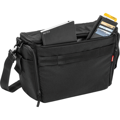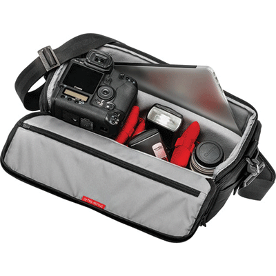 کیف شانه آویز مانفروتو زیبا و بادوام دارای ظرفیت یک عدد دوربین DSLRبا گریپ و لنز 200-70، 4 لنز اضافی،فلاش،لوازم جانی(کارت حافظه،شارژر،کابل)،لپ تاپ تا 13 اینچ و تبلت.