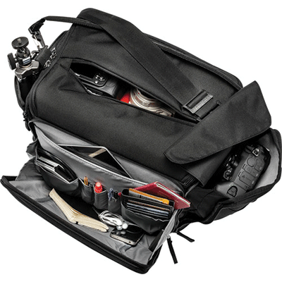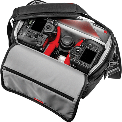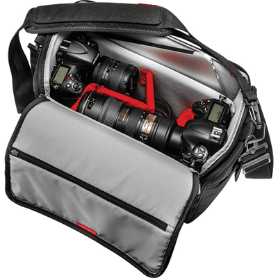 کیف شانه آویز مانفروتو زیبا و بادوام دارای ظرفیت دو عدد دوربین DSLRبا گریپ و لنز 200-70، 7 لنز اضافی،فلاش،لوازم جانی(کارت حافظه،شارژر،کابل)،لپ تاپ تا 13 اینچ و تبلت.