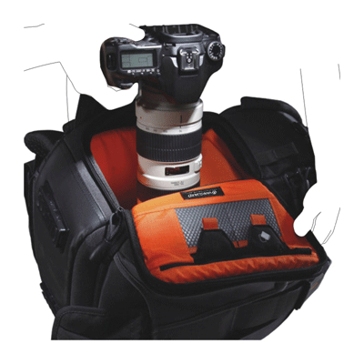 کیف کوله پشتی زیبا و با ظرفیت 1دوربین حرفه ای DSLR با گریپ و لنز متصل شده ( up to 70-200mm f/2.8)، و1 تا 2لنز اضافی ، 1 فلاش،و لوازم جانبی (کارت حافظه، کابل، باتری، تلفن همراه و شارژر) به علاوه یک لپ تاپ تا سایز 12 اینچ