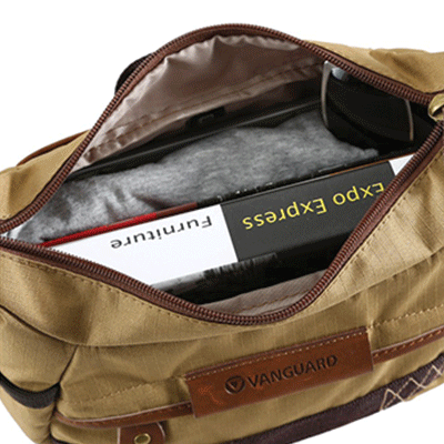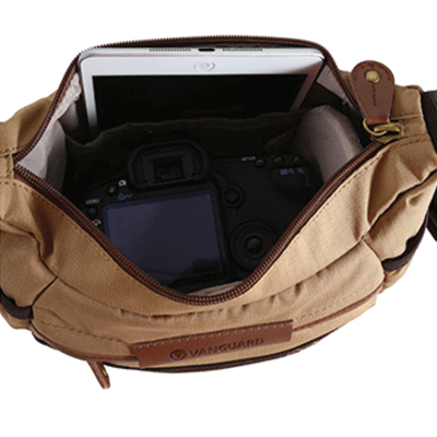 کیف شانه آویز ونگارد زیبا و بادوام و دارای ظرفیت1 عدد دوربین DSLR با لنز زوم متوسط متصل شده،1 یا 2لنز اضافی،1فلاش و لوازم جانبی (کارت حافظه، کابل، باتری و شارژر)،تبلت تا 7 اینچ