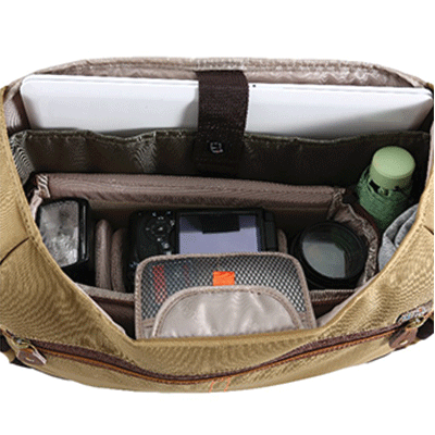 کیف شانه آویز زیبا و بادوام و درای ظرفیت 1عدد دوربین DSLR با لنز زوم متوسط متصل شده،2 یا 3لنز اضافی،1فلاش و لوازم جانبی (کارت حافظه، کابل، باتری و شارژر)،لپ تاپ 15اینچ
