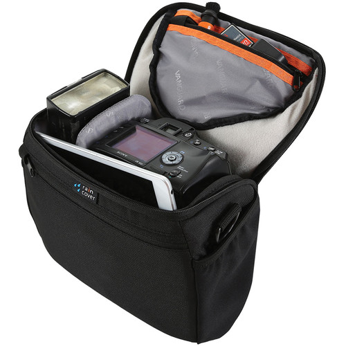 کیف شانه آویز ونگارد Oslo 22 مشکی Vanguard برای نگهداری و محافظت از DSLR با لنز متصل ، 1 تا 2 لنز اضافی ، فلاش ، تبلت 7 اینچی و لوازم جانبی طراحی شده است. در زیر درب کیف یک جیب زیپ دار برای لوازم جانبی کوچکتر مانند کارت حافظه ، درب لنز و باتری وجود دارد.