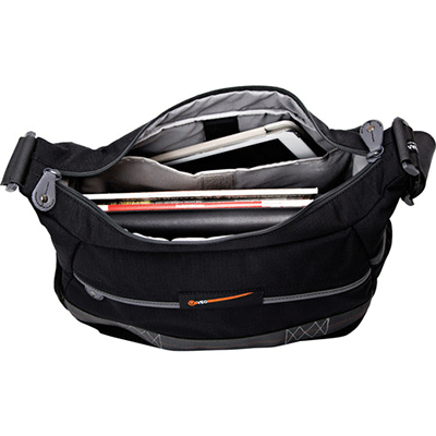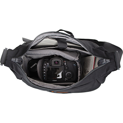 کیف شانه آویز ونگارد زیبا و بادوام دارای ظرفیت1عدد دوربین DSLR با لنز80-300mm متصل شده،و لوازم جانبی (کارت حافظه، کابل، باتری و شارژر)،لپ تاپ 11 اینچ