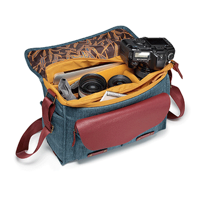 کیف شانه آویز مناسب برای یک دوربین DSLR با لنز متصل شده و به همراه 2 عدد لنز اضافی دارای محفظه ای لپ تاپ ، شارژر و لوازم شخصی.