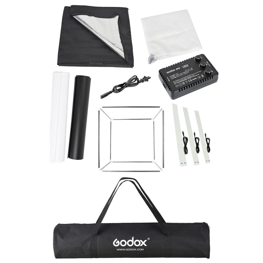 خیمه ال ای دی دار 60 سانتی متر گودکس با قابلیت حمل و راه اندازی سریع، مناسب برای عکاسی ماکرو و عکاسی از محصولات با راه اندازی آسان با قابلیت تنظیم میزان روشنایی نورها(دیمر کنترل کننده ) به همراه سه ردیف نور ال ای دی با قابلیت تنظیم آزادنه حرکتی به همراه پارچه دیفوزر ، با CRI>96 و به همراه کاور حمل