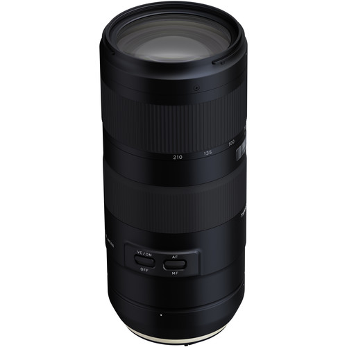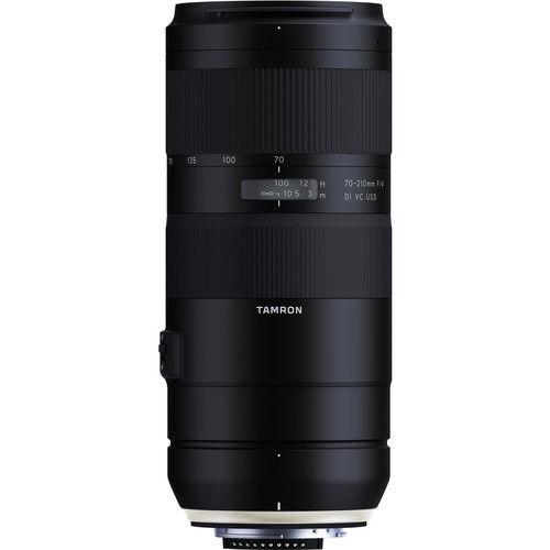 لنز تامرون Tamron 70-210mm برای دوربین های کانن با فرمت فول فریم (و سازگار با APS-C با فاصله کانونی معادل 336-112 میلی متر) دارای موتور فوکوس بی صدا و سریع، دارای لرزش گیر و با دامنه دیافراگم f:4 تا f:32
