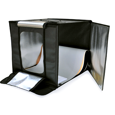 خیمه عکاسی سبک و قابل حمل با اندازه 40 در 40 سانتی متر دارای نور داخلی دو رنگ (با دمای رنگ از ۳۲۰۰ تا ۵۶۰۰ کلوین ) به همراه پارچه دیفیوزر نرم کننده، دارای 4 عدد پس زمینه با رنگ های سفید، مشکی، نارنجی و خاکستری با قابلیت راه اندازی آسان و جمع آوری سریع به صورت یک کیف قابل حمل و دارای دیمر جهت تنظیم میزان روشنایی.