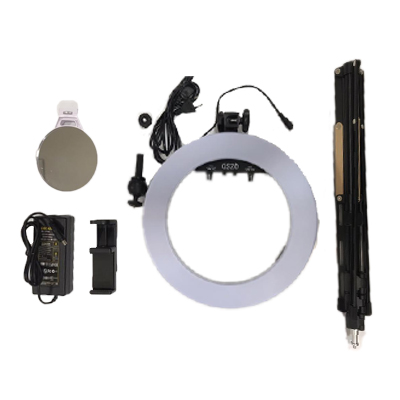 رینگ لایت مدل RL-12L با قدرت 24 وات ، دارای قطر داخی 26.5 سانتی متر ، قطر خارجی 34.5 سانتی متر ، با قابلیت تغییر میزان روشنایی و کلوین از 3200 تا 5600، سازگار با 2 عدد باطری سری 970 سونی (که به صورت جداگانه باید تهیه شود)، دارای آداپتور برق مستقیم ، به همراه نگه دارنده موبایل ، بال هد جهت اتصال دوربین های کوچک ، پایه نور تاشو (با حداکثر ارتفاع 182 سانتی متر)، آینه و کیف حمل مخصوص