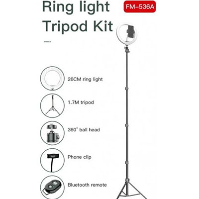 کیت رینگ لایت جی مری JMARY FM-536A به همراه سه پایه با قطر خارجی 26 میلی متر و قطر داخلی 20 سانتی متر ، دارای 120 عدد ال ای دی ، با قدرت خروجی 8 تا 10 وات ، قابل استفاده از طریق پورت USB ، با قابلیت تغییر رنگ گرم ، سرد و میکس ، با دامنه کلوین 3000 -6500 ، با CRI>96 ، شامل یک سه پایه ( با دامنه ارتفاع 55 تا 170 سانتی متر) ، هولدر نگه دارنده موبایل ، بال هد