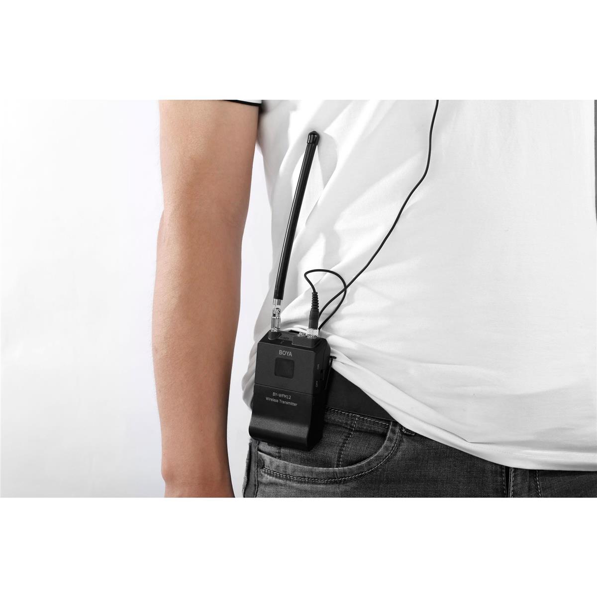 کیت میکروفن بی سیم بویا مدل BOYA BY-WFM12 یک سیستم میکروفون بی سیم VHF با 12 کانال است که سازگار با تلفن های هوشمند، دوربین های DSLR ، دوربین فیلمبرداری، رکوردرها صدا ، رایانه های شخصی می باشد. هر فرستنده دارای دو سوکت MIC(میکروفن) است که امکان استفاده همزمان از دو میکروفون را فراهم می کند.(یک میکروفن داخل پکیج است) ، با برد حداکثر تا 40 متر ، گیرنده دارای خروجی هدفون جهت مانیتور کردن صدا هنگام ضبط