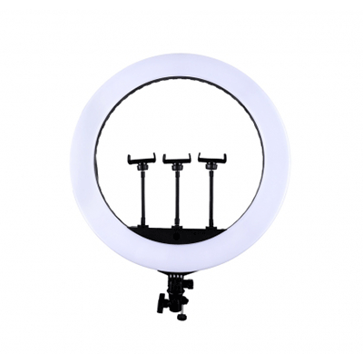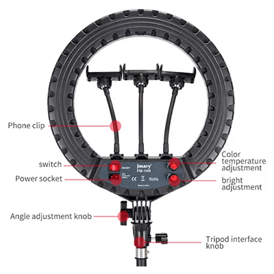 کیت رینگ لایت جی ماری مدل Jmary FM18R به همراه پایه نور، با ابعاد خارجی 43.5 سانتی متر، ابعاد داخلی 32.5 سانتی متر ، دارای 112 عدد حباب ال ای دی ، با قابلیت تغییر کلوین از 2900 تا 6500 کلوین ، دارای CRI >80 ، قابل استفاده از طریق آداپتور برق مستقیم با قدرت خروجی 55 وات ، به همراه 3 عدد هولدر نگه دارنده موبایل ، به همراه ریموت کنترل و سیم برق