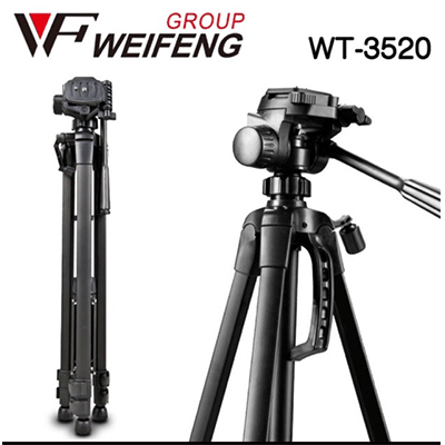 سه پایه عکاسی ویفینگ Weifeng WT-3520 با تحمل وزن حداکثر 3 کیلوگرم ، وزن 980 گرم، حداکثر ارتفاع 140 سانتی متر ، ارتفاع جمع شده 56 سانتی متر ، حداقل ارتفاع 54.5 سانتی متر به همراه دستگیره جهت حمل آسان ، دارای 2 عدد تراز به همراه کاور جهت حمل و نقل