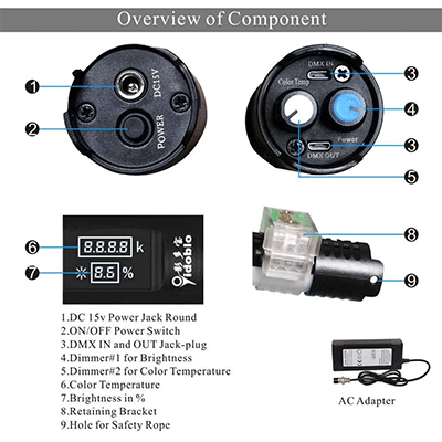 تنظیم برق: با چرخاندن دیمر برای تنظیم روشنایی از 0٪ به 99٪. دستی و قابل حمل: که به همراه هولدر نگه دارنده استاندارد 1/4 می توانید آن را روی سه پایه نصب کنید