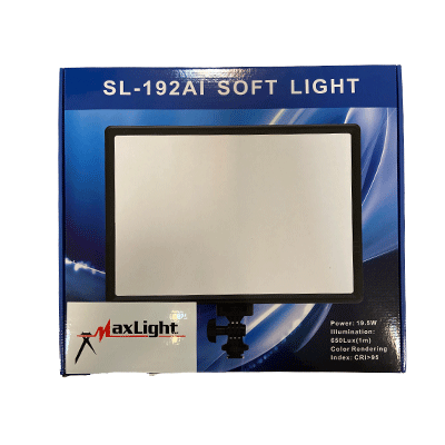 نور ال ای دی مکس لایت MAXLIGHT SL-192AI با قدرت 19.5 وات ، با روشنایی 650 لوکس بر متر ، با CRI>95 ، با قابلیت تنظیم روشنایی از 0 تا 100 درصد ، تغییر کلوین از 3200 تا 5600 ، دارای 192 عدد ال ای دی ، دارای صفحه نمایش جهت مشاهده تنظیمات ، دارای باتری داخلی با طول عمر حدود 1 ساعت ، با ابعاد 266X26.5X188 میلی متر