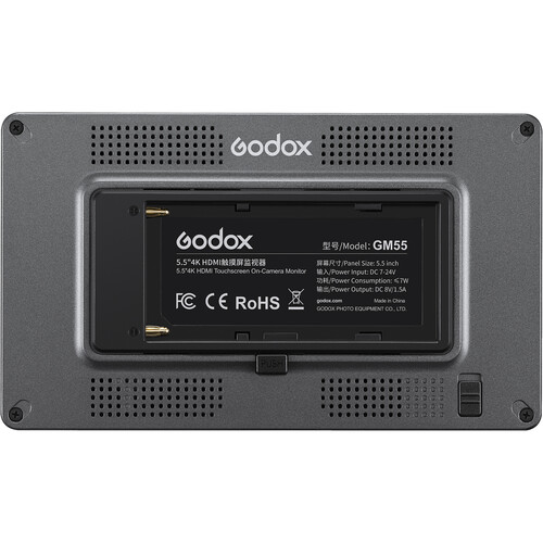 Godox GM55 یک مانیتور جمع و جور 5.5 اینچ (تقریبا 14 سانتی متر) با طراحی پلاستیکی سبک، صفحه نمایش لمسی با رزولوشن p1080 و دارای ورودی و خروجی HDMI است که سیگنال های دوربین را تا DCI 4K24 و UHD 4K30 پشتیبانی می کند و برای نصب روی دوربین می باشد. خروجی به شما امکان می دهد تا به یک فرستنده بی سیم متصل شوید تا اپراتورهای دیگر بتوانند تصویر روی مجموعه را کنترل کنند.
